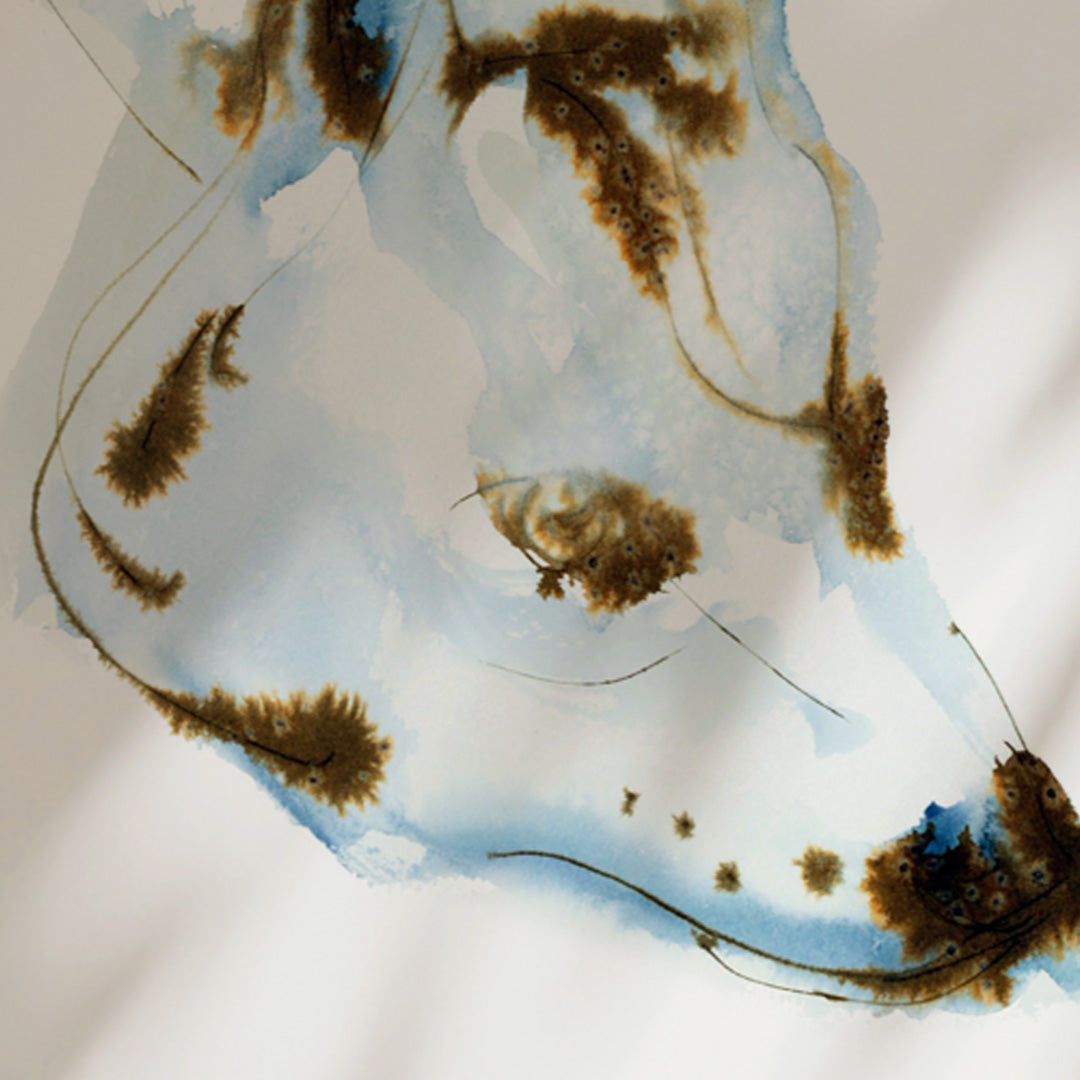 This fine art print features a striking blue dog, originally painted using ink, watercolour, and salt techniques. The piece is full of character and quiet intensity, with expressive ink, textured salt craters, and soulful eye detail that draws you in and invites a moment of connection.